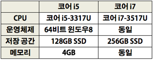 ▲ 울트라북 성능 비교에 쓰인 두 제품 사양표.