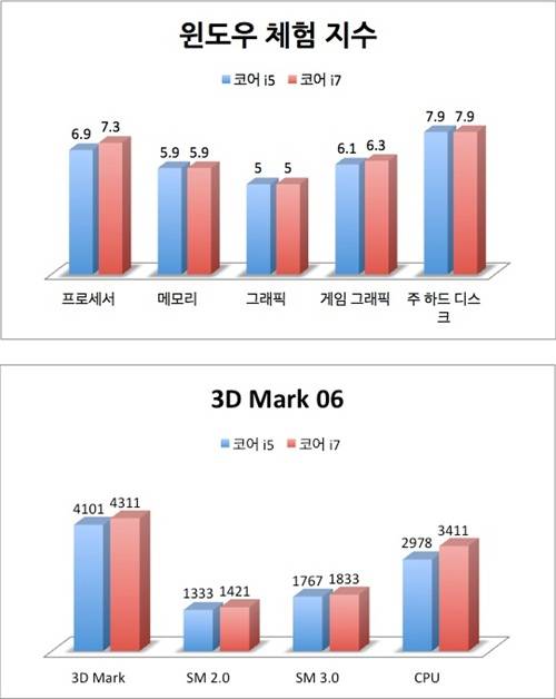 코어 i5와 코어 i7 성능 차이는? 벤치마크 결과는 당연한 이야기겠지만 코어 i7 제품이 뛰어나다. 조금이라도 빠른 노트북을 원한다면 역시 코어 i7 모델을 선택해야 할 것이다. 다만, 인터넷 검색하고 SNS 등 평소 PC 사용 범위에서의 두 제품간 성능 체감은 힘들다. 빠른 전송 속도를 구현하는 SSD 덕분에 모두 제 값어치를 한다. 예컨대 대용량 이미지를 편집하고 캐드 시스템에 접속하여 도면을 그리고 다른 작업자와 공유, 의견을 나눈다면 코어 i7 모델도 턱없이 모자르겠지만, 글 쓰고 표계산하고 발표자료를 만드는 데 코어 i5 모델이 충분한 실력 발휘를 하지 않을까 싶다.