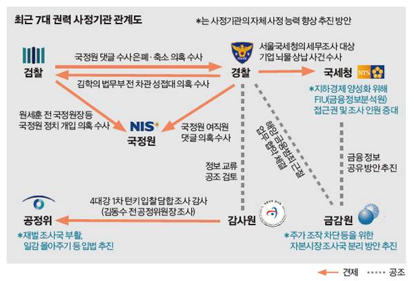 새 정부 들어 사정 기능을 강화하는 것은 비단 감사원과 경찰뿐만이 아니다. 현 정부는 지하경제 양성화를 위해 국세청의 FIU(금융정보분석원) 자료 이용 확대 방안을 추진 중이다. 또 금감원 차원에서는 이른바 '경제 중수부'로 통하는 자본시장조사국을 별도 조직으로 분리하는 방안을 논의하고 있다. 정권 교체기를 틈탄 사정기관의 '힘 키우기' 사례다. 자연히 다른 사정기관들이 민감하게 반응할 수밖에 없다. 특정 사정기관의 힘이 커지면 자신의 위상이 상대적으로 약화되고, 자칫 이것이 부메랑이 돼 자신이 사정 대상이 될 수 있다는 우려도 민감한 반응을 보이는 이유 중 하나다.