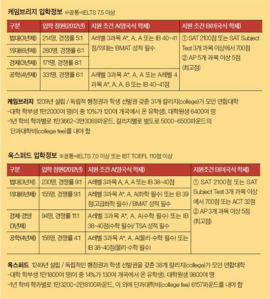 영국 명문대에 지원하기 위해선 영국식 또는 미국식 고교 학제를 이수해야 한다. 영국 학제에 해당되는 A레벨·IB디플로마 또는 미국 대학 입학 시험인 ACT·SAT와 AP(대학 과목 선이수제) 성적을 요구하기 때문이다. 조건부 합격 허가를 받은 후 최종 합격하기 위해선 해당 성적을 제출해야 한다. A레벨은 영국 대학 입학 시험으로 A*(최고점), A, B, C, D, E, U, N까지 8등급으로 나뉜다. IB디플로마(45점 만점)는 세계 150개국에서 활용되는 대학 입학 시험이다. 현재 한국에서 IB디플로마 교육과정을 제공하는 학교는 경기 외국어고, 경기 수원 외국인학교, 서울 외국인 학교, 대전 외국인 학교, 부산 국제 외국인 학교, 노스 런던 칼리지에이트 스쿨 제주까지 6개 학교가 있다.