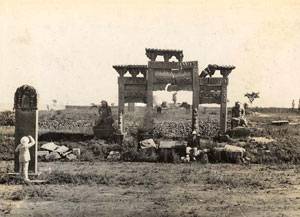 ↑ 당나라의 수도 장안이었던 서안에서 1930년대에 찍은 대진사의 유적. 왼쪽의 큰 비가 대진경교유행중국비다. |