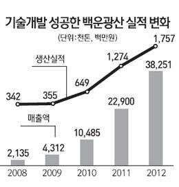 하지만 토종업체 GMC가 2009년 중탄 생산에 성공하면서 상황은 달라졌다. GMC는 절치부심 끝에 석회석 초분체 가공기술을 독자적으로 개발했고 백운광산을 바탕으로 국내 중탄 시장 점유율을 20%까지 끌어올렸다. 한솔제지 등 국내 주요 제조업체에 연간 25만톤 규모의 중탄을 납품하고 있으며 지난해에는 흑자 전환에도 성공했다. 2018년까지 매출을 2,000억원 수준으로 끌어올릴 계획이다.