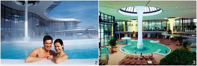 ↑ 2 유럽 사우나는 남녀가 같이 오는 경우가 많다. 3 유럽 스파에는 사우나 외에도 수영장, 야외 일광욕을 즐길 수 있는 장소가 있다. |