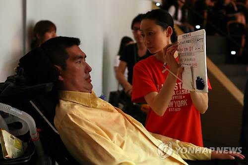 (서울=연합뉴스) 홍해인 기자 = 박승일 전 프로농구 울산모비스 코치가 4일 저녁 서울 광화문 KT올레스퀘어 홀에서 승일희망재단 주최로 열린 '희망을 만들어가는 ing 콘서트'에 참석해 여자친구 김중현 씨와 글자판을 통해 대화를 나누고 있다. 승일희망재단은 2002년 루게릭병 진단을 받고 현재 투병 중인 박승일 전 코치와 가수 션이 공동대표를 맡아 루게릭병 및 희귀질환 환자 치료를 후원해 오고 있다. 이날 행사의 입장권 판매 등 수익금 전액은 루게릭 요양병원 건립 기금으로 기부된다. 2013.6.4