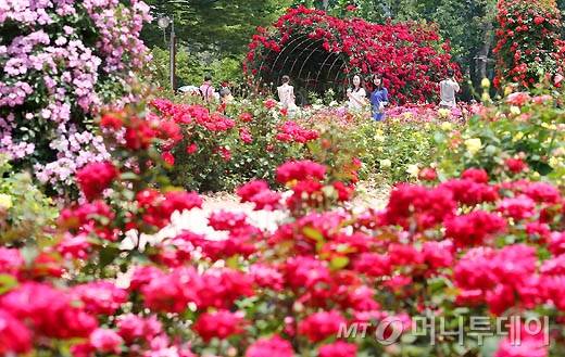 7일 오후 서울 송파구 방이동 올림픽공원 장미 광장일원에서 열리는 장미축제를 찾은 시민들이 장미꽃과 함께 즐거운 시간을 보내고 있다. 장미축제는 오는 11일까지 계속된다.