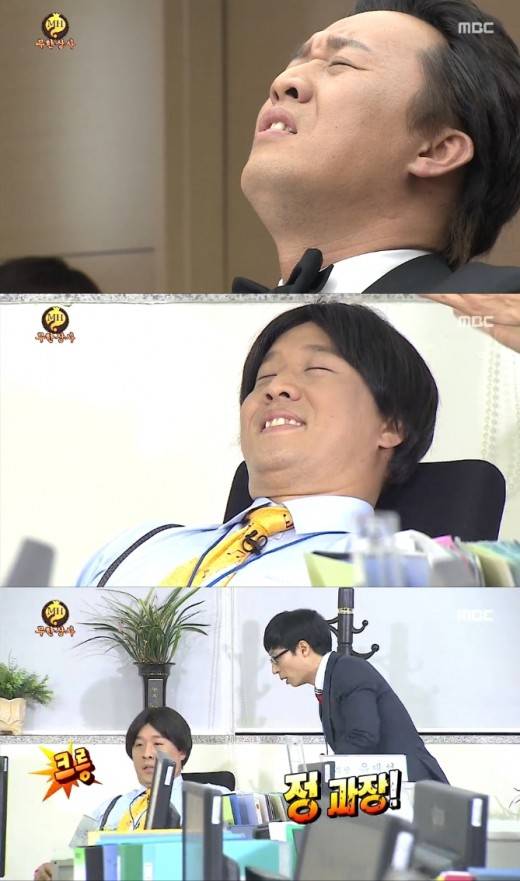 하지만 이 모든 것은 정준하의 꿈이었다. 유재석 부장 자리에서 단꿈을 자고 있던 정준하는 "내가 잠깐 잠 들었네"라며 회장 행세를 했다.