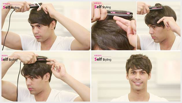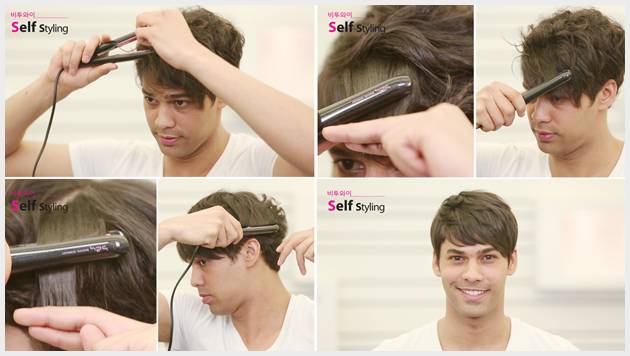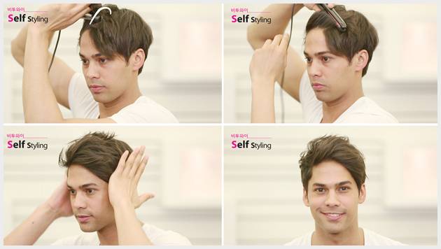 먼저 모발의 적당량을 잡고 아이롱으로 한바퀴씩 말아준다. 동일한 방법으로 앞머리와 옆머리 전체를 좌,우로 교차하며 한바퀴씩 말아준다. 마지막으로 왁스를 이용해 윗머리의 볼륨을 살려주고 살짝 삐친듯이 만지면서 정리해 주면 된다.