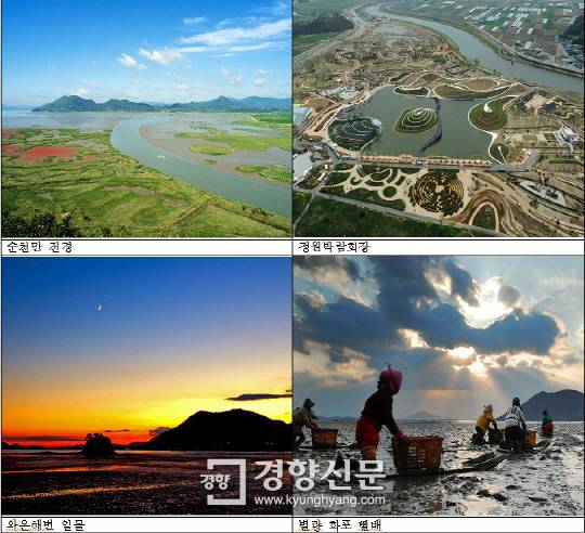 전남 순천시가 10일 내놓은 2박3일 일정의 남도 피서지. 좌측 상단부터 시계바늘 방향으로 순천만 전경~순천정원박람회장~ 와온해변 일몰광경~별량면 화포마을 뻘배 타는 보습이다. /순천시 제공'체험이 있는 순천여행'은 콘크리트 즐비한 도시에서 잠시 벗어나 경이로운 자연과 만나는 여행 코스로 순천만과 정원박람회를 관람한 뒤 와온해변 해넘이를 감상하고 숙박한 다음 향림사 → 드라마촬영장 → 점심식사 → 낙안읍성 → 주암호 드라이브 → 고인돌 공원 → 귀가 코스다.