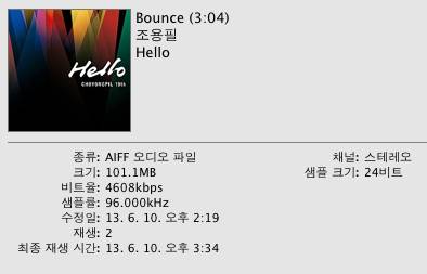 이렇게 해서 조용필 19집의 경우, 네이버 뮤직에서 부가세 포함해 1만9800원에 다운로드받은 'Bounce' 'Hello' 등 10곡이 모두 aiff 파일로 변환돼 아이튠즈에 저장됐다. 음원 스펙은 24비트에 96kHz. 'Bounce'의 경우 비트율이 4608kbps(기존 mp3는 320kbps)이고 파일 용량은 무려 101.1MB(기존 mp3는 7.1MB)에 달했다. 청취환경은 맥북프로+아이튠즈+오더버나 플러스에 오디오퀘스트의 초소형 디지털아날로그컨버터(DAC)인 드래곤플라이를 연결, 유선 헤드폰으로 감상하는 환경.