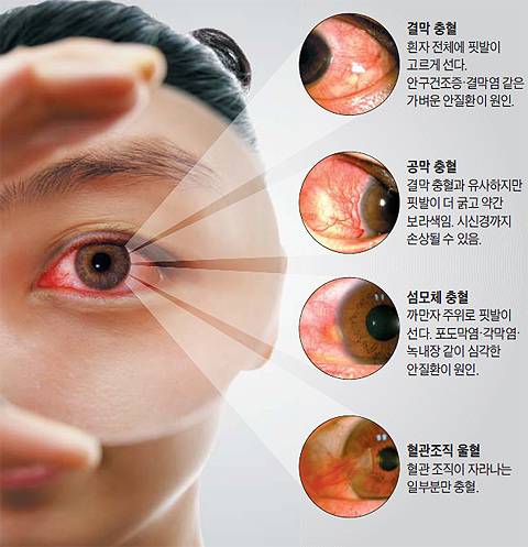 눈 충혈은 증상에 따라 크게 4가지로 나뉘는데, 공막 충혈과 섬모체 충혈은 절대 가볍게 넘겨선 안된다.