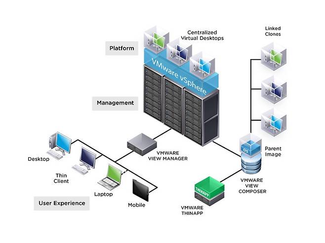 VM웨어는 모바일 하이퍼바이저를 사용해 서버 가상화처럼 모바일 단말기에 여러 게스트OS를 올려 이 중 하나에 업무 영역을 별도로 만들고 이 업무 영역에서 중앙 서버의 작업 공간에 접속한다. 모바일 하이퍼바이저(VM웨어 호라이즌 모바일)는 기업 서버에 있는 엔드유저 컴퓨팅 포털(VM웨어 호라이즌 워크스페이스)에 접속하는 통로가 된다.