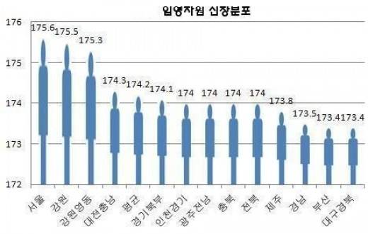 이어 강원 175.5cm, 강원영동 175.3cm, 대전충남 174.3cm 순으로 나타났다. 반면 대구경북은 173.4cm로 최하위권을 기록했다.