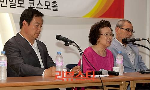 한영수 노조위원장, 배우 나문희, 기정수 탤런트 지부장이 19일 오후 2시 서울 영등포 여의도동에 위치한 국민일보 사옥 코스모홀에서 열린 한국방송연기자노동조합(이하 '한연노') 긴급 기자회견에 참석해 이야기를 하고 있다.