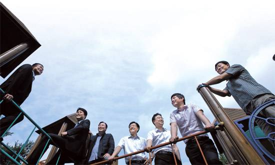 지난 4개월 동안 주말도 반납하고 어린이집 비리와 전쟁을 벌이고 있는 서울 송파경찰서 지능범죄수사1팀 팀원들이 주말인 지난 15일 오랜만에 경찰서 인근 어린이 놀이터에 나와 휴식 시간을 갖고 있다. 왼쪽부터 박준철·민종기(팀장)·이용우(계장)·김영준·김용현·김원충·이주환 수사관. [권혁재 사진전문기자]