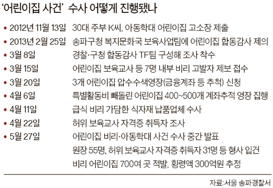 3월 말 어린이집에서 벌어지는 불량급식 제공, 국고보조금·특별활동비 횡령 등 갖가지 유형의 비리가 서서히 드러나기 시작했다. 수사 대상도 송파구뿐 아니라 강남·관악·서초·강동구를 비롯해 성남·의정부 소재 어린이집으로 확대됐다. 수사 과정에서 송파구의회 현직 의원 이모씨가 어린이집 5개를 운영하며 지난 3년 동안 수억원을 빼돌린 단서도 포착했다.