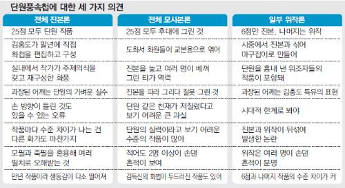 이중희 교수의 논문은 학계의 전반적 의견과 맥을 같이한다. 보물로 지정된 화첩은 당연히 진품이라는 것이다. 국립중앙박물관 보존과학실의 천주현 학예연구사(43)도 지난해 화첩의 재질과 필치를 분석해 단원 한 사람이 그렸다는 논문을 발표했다.