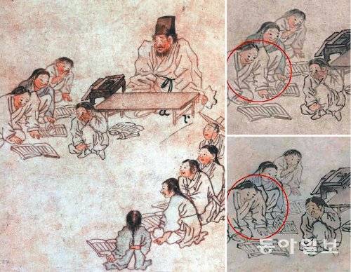 단원풍속도첩 가운데 대표작으로 꼽히는 '서당'. 오른쪽 위의 두 그림은 서당에서 왼쪽 위에 있는 학동의 과장된 어깨 부분으로, 강관식 한성대 교수는 아래 그림처럼 수정하면 훨씬 자연스럽다며 모사본의 증거라고 봤다. 다른 학자들은 이를 김홍도의 특징으로 보거나 가벼운 실수라고 주장한다. 동아일보DB·강관식 교수 제공 |
