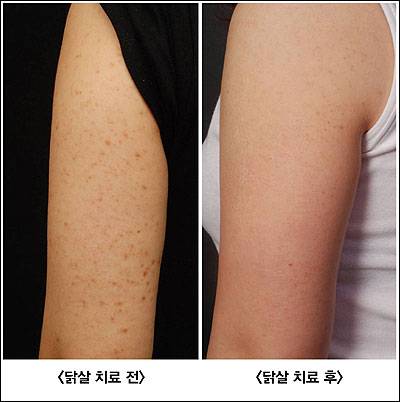 ◇치료효과는 높이고 재발률 낮아진 '레이저+박피의 결합치료'= 기존에는 각질용해제, 화학적 또는 기계적 박피, 비타민 D3요법, 국소 또는 전신 레티노이드, 레이저 치료 등 다양한 방법으로 닭살을 치료해왔지만 재발 주기가 짧고 증상완화가 어려웠다. 최근에는 '레이저=박피의 결합치료'라는 완치율이 높은 새로운 치료법이 주목을 받고 있다. 이 치료법은 레이저와 박피를 결합한 세 단계 치료를 통해 개선효과는 더 높아진 반면 재발률은 더 낮춘 것이 특징으로 유럽레이저학회지인 '미용레이저치료학회지'(SCI저널)에 연세스타피부과 연구진(김영구, 이상주, 정원순)과 연세대학교 의과대학 피부과연구소(최민주, 조성빈, ZHENLONG ZHENG)가 '모공각화증 치료를 위한 595nm 펄스 색소레이저, 755nm 롱펄스 알렉산드라이트 레이저, 박피술의 결합치료'를 주제로 발표하면서 알려졌다.