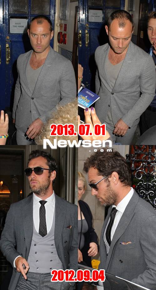 주드 로는 탈모가 급격히 진행돼 충격적으로 변해버린 모습이었다. 불과 지난해 9월 포착된 사진과 비교해봐도 확연한 차이를 느낄 수 있다.
