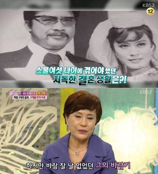1970년대에 전성기를 누린 영화배우 배우 최정민이 17년 만에 방송에 모습을 드러냈다. 그는 5일 KBS2 '여유만만'에 게스트로 출연해 "정신없이 바쁜 연예계 생활 속에서 경제적 부담이 커져가고, 극심한 스트레스와 회의를 느끼기 시작했다. 가정주부로서 다른 인생을 살아보자는 생각을 했다. 나와 작품을 같이하던 남자배우가 아는 사람을 소개해줬다. 남편의 적극적인 구애로 두 달 만에 결혼했다"고 말했다.