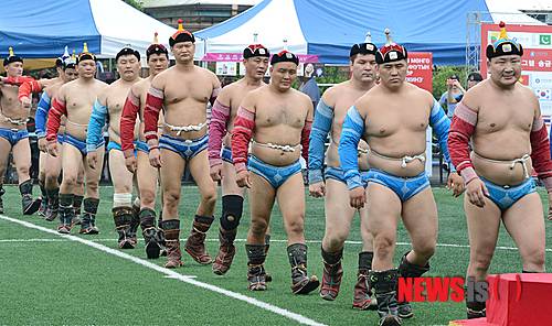 【서울=뉴시스】이종철 기자 =몽골울란바트르 문화진흥원 주최로 7일 서울 광진구 광장초등학교에서 열린 2013 제13회 "나담"축제에서 몽골씨름 부흐대회에 참가한 전통씨름 선수들이 입장하고 있다. 2013.07.07