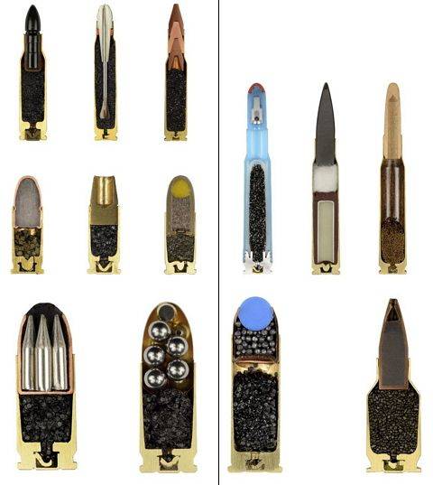 사진은 소총과 같은 현대식 총기에 쓰이는 총알을 수평으로 자른 모습을 보여 준다. 이로써 각 총알 안에 배열된 구성요소들의 적재방식이나 목표물에 살상력 또는 파괴력을 전달하는 원리를 짐작할 수 있다.
