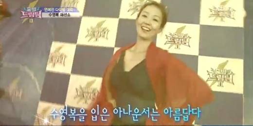 이날 오정연은 수영복을 입고 등장해 군살 하나 없는 몸매를 유감없이 드러냈다. 오정연은 발레로 다듬어진 S라인 몸매로 남성 시청자들 시선을 사로잡았다.