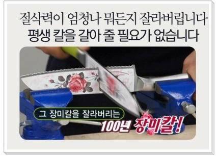 #4 한 업체 제품만 40만개가 팔렸다는 장미칼 홈쇼핑 광고에서 `주방용도로 사용했을 때 30년간 품질 보증`한다고 나온다. 그러나 실제로 주방에서 쇠파이프나, 나무도막을 자르는 때가 얼마나 있을까. 온라인 카페 등 커뮤니티에서는 장미칼 구매 후기로 `실제로 나무가 잘리지 않았다` `쇠파이프가 안 잘린다` 등 불만을 토로하기도 했다. 정품 구매도 유의할 일이지만 칼은 적절한 용도에 맞게 쓰는 것이 가장 좋은 방법이다.