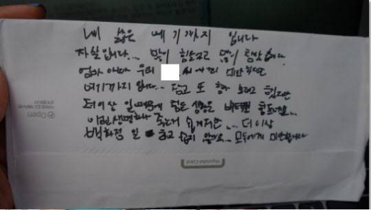 A씨는 자살하기 전 봉투 뒷면에 유서를 썼다. "내 삶은 여기까지 입니다. 자살입니다. 많이 힘들었고 많이 참았습니다. 엄마 아빠 우리 00씨에겐 미안하지만 여기까지 입니다. 참고 또 참아보려고 했지만 더 이상 일 때문에 힘든 상황을 버텨내기 힘드네요. 이런 생명하나 죽는거 쉽겠지만 더 이상 백화점 일 하고 싶지 않아요. 모두에게 미안합니다."