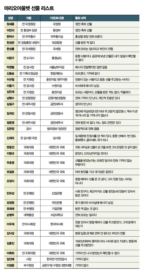 특히 금천구나 구로구 기관장들은 홍 회장과 직접적인 이해관계에 얽혀 있다는 점에서 의혹을 더한다. 문건에 따르면 홍 회장은 박영렬 전 남부지검 검사장과 한인수 전 금천구청장, 정준영 전 금천세무서장, 하석균 전 구로소방서장 등에게도 선물을 보냈다. 마리오아울렛은 심지어 구청 과장급이나 계장급에게도 무더기로 선물을 뿌렸다. 담당자가 바뀐 부서의 경우 전 담당자와 현 담당자를 표시하는 등 체계적으로 관리해온 것으로 드러났다. 문건에는 이들이 "잘 받았다"고 확인한 내용까지 담겨 있다.
