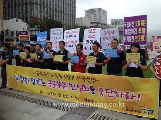 국가행정기관인 국가정보원이 대선에 직접 개입한 심각한 부정선거의 증거가 속속 발견되었다. 박근혜 후보를 지지하는 언론조작에 앞장선 것도 모자라, 진실을 덮고 정치 쟁점을 흐리기 위해 NLL대화록을 폭로하는 등 노골적인 공작정치에 나서고 있다. 노동자, 시민의 투쟁으로 어렵게 쟁취한 형식적 민주주의마저 전면적으로 부정되고, 군사독재 시기에나 있었을 행태가 버젓이 벌어지고 있다. 국정원의, 국정원에 의한, 국정원을 위한 정책으로 일관하는 새누리당 박근혜 정부는 이제 '국정원 정부'라 불러도 손색이 없다.우리 노동자들은 민주주의를 지키는 최전선에서 투쟁해왔다. 87년 노동자 대투쟁, 96~97년 노동법·안기부법 날치기 저지 총파업은 물론, 민주주의가 위기에 있을 때마다 이를 외면하지 않았다. 앞장서 나서고 끝까지 투쟁해왔다. 바로 지금이 그런 민주주의의 위기 상황이다.우리 공공부문, 운수산업 노동자들은 '국정원 정부'의 선택이 노동기본권 탄압과 민영화를 통한 민생파탄이라는 점에도 주목한다. '국정원 정부'의 민주주의 말살은 공무원노조, 전교조 등 공공부문 노동조합에 대한 탄압은 물론, 비정규직·특수고용노동자에 대한 탄압으로 이어지고 있다. 이들이 민주주의를 탄압하는 이유는 결국 재벌과 자본, 가진 자의 이익을 지키기 위해이며, 그 결과가 민영화 정책이다. '국정원 정부'는 곳곳에서 국민을 기만하고 있다. 마치 국정원 선거개입 은폐처럼 철도, 전력·가스, 물, 의료 등 민중 생존에 필수적인 공공부문에 민영화를 추진하면서도 민영화가 아니라고 은폐하고 있다.우리 공공부문, 운수산업 노동자들은 민주주의와 노동기본권을 사수하고, 민영화를 저지하기 위해 투쟁해왔다. 우리는 이 투쟁이 "국정원 정부"의 민주주의 파괴에 저항하는 시민들의 투쟁과 다르지 않다고 보고, 민주주의를 지키기 위한 행동에 함께 할 것이다. 민주주의 파괴, 민생파탄을 중단시키기 위해 투쟁하는 것은 시민의 정당한 주권과 저항권 행사임을 선언한다.첫째, 정부는 국정원의 선거개입에 대해서 모든 진상을 공개하고, 그 책임자는 직위고하를 막론하고 전원 처벌하고 공직을 사퇴하라!둘째, 정부는 민주주의를 파괴하는데 앞장선 국정원 등 공안기구를 해체하고 전면 개혁하라!셋째, 정부는 노동현장의 민주주의 파괴 정책인 노동기본권 탄압을 중단하고, 민생파탄 공공부문 민영화 정책을 즉각 폐기하라!2013년 7월 17일민주노총 전국공공운수사회서비스노동조합·연맹중앙집행위원 일동