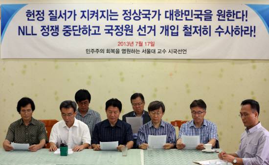 ▲ 서울대학교 교수들은 17일 오전 서울대학교 교수회관에서 "NLL 정쟁을 중단하고 국정원 선거 개입을 철저히 수사하라"며 시국선언문을 발표했다.©연합뉴스 |
