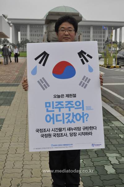 [미디어오늘 이아인 기자] 제헌절을 맞이해 국정원을 규탄하는 각계의 시국선언 및 시위가 '봇물'터졌다. 17일 보건의료단체연합, 민주노총 전국공공운수사회서비스노동조합‧연맹, 서울대학교 교수들, 방송통신대학교 교수들 등은 시국선언을, 시민단체는 전국 동시 1인 시위와 인증샷 행동에 나섰다.