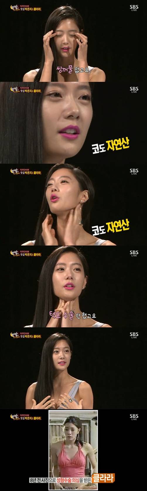 클라라는 24일 오후 방송된 SBS '한밤의 TV연예'에 출연해 "전혀 성형수술을 하지 않았다"고 말했다.이날 클라라는 "쌍꺼풀도 안 했고 코도 안 했고 턱도 안 했다"며 자연미인임을 강조했다. 이어 "나는 (가슴도) 열심히 모은다. 모아서 풍만함을 보여주는 것"이라고 말했다.