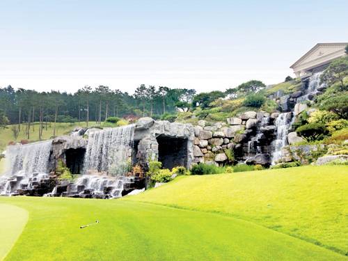충북 진천에 위치한 크리스탈 카운티 골프장 클럽하우스 아래 만들어진 인공 폭포는 단연코 국내 골프장 명물을 꼽을 때 열 손가락 안에 들 것이다.