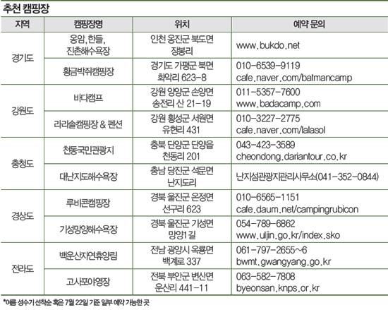 캠핑 마니아들은 여름을 캠핑 비수기로 여긴다. 날씨가 무더워 활동하기 힘든 데다 휴가철이라 사람들이 몰려 캠핑의 여유를 만끽하기 어렵기 때문이다. 하지만 물놀이를 좋아하는 아이들에겐 여름 캠핑만큼 좋은 시간도 없다. 다만 여름 캠핑 때는 장마와 무더위를 감안해 준비할 것들이 많다.