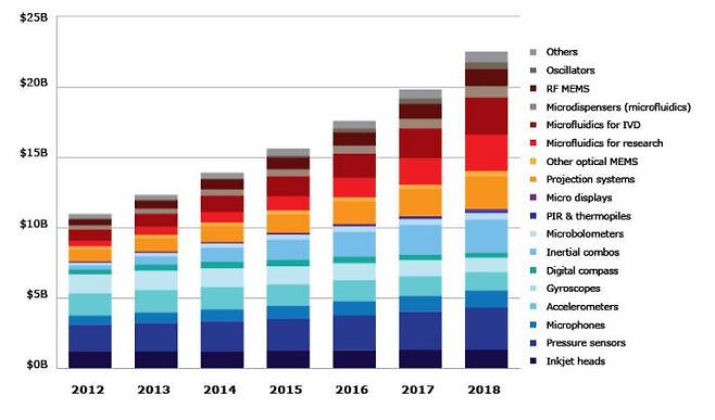 시장조사업체 욜디벨로페먼트 조사에 따르면 MEMS 시장은 지난해 기준 110억달러(약 12조 3332억원)에 달한다. 오는 2018년에는 230억달러(약 25조7876억원)에 이를 것으로 예상된다.