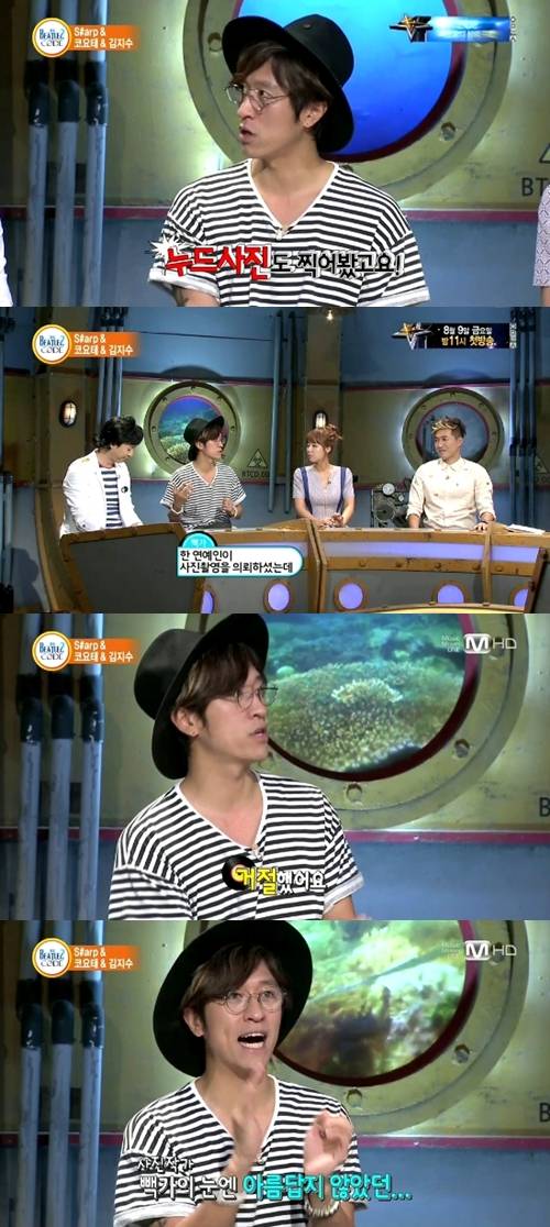 이에 빽가는 "카메라만 치우면 도저히 쳐다볼 수 없을 정도로 민망하다. 하지만 카메라로 찍으면 다르다. 사실 유명 연예인으로부터 본인의 누드사진을 찍어달라는 요청까지도 받았다. 하지만 거절했다. 내가 볼때 아름다운 몸매가 아니었기 때문이다"고 말했다.