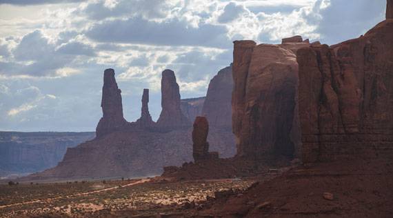 그런데 실제로 모뉴먼트 밸리 안에서 느껴지는 것은 '시간'이다. 1억6000만년 전 바다가 퇴각한 직후부터 사암 고원지대가 허물어지며 남은 것이 눈앞에 보이는 거대한 바위산들이다. 억겁 세월과 무관하게 지구상에 존재해온 바위산들이다. 그러니 해가 뜰 때, 해가 질 때, 해가 머리 위에 있을 때, 해가 사라지고 천둥 번개가 칠 때 그 어떤 때에도 바위산은 당연히 자리를 지키고, 사람들은 그저 꼬물거리며 넋을 잃고 제대로 움직이지도 못한다. 공원 내 총연장 28㎞ 비포장도로를 차를 몰고 다니면 최소 두 시간이 걸린다.
