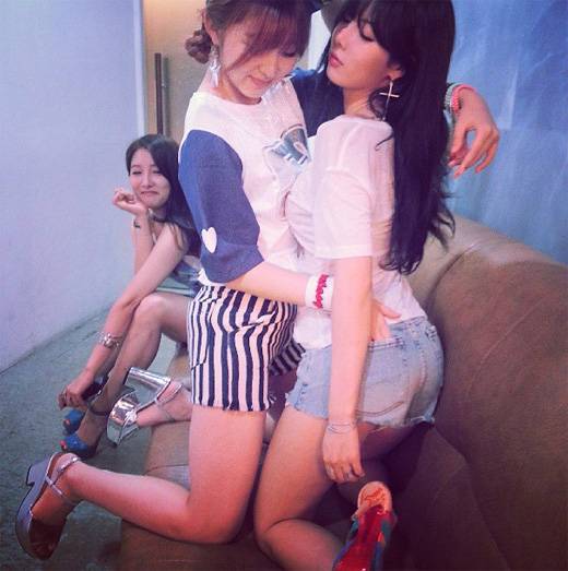 사진 속 현아는 포미닛 멤버 권소현과 함께 요염한 자세로 소파에 앉아 커플 셀카를 찍고 있다. 멤버들과 장난을 치는 와중에도 정색한 표정으로 명품 뒤태를 과시하는 모습이 귀엽기까지 하다.