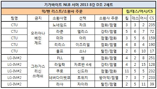 LG-IM 2팀이 17일, 나이스게임TV에서 온라인으로 생중계한 기가바이트 NLB 서머 2013의 8강 2회차 D조 2세트에서 CTU에게 0:2 패배를 안기며 4강 진출 티켓을 확보, 탈락한 형제 팀을 대신해 상위 라운드에 안착했다.