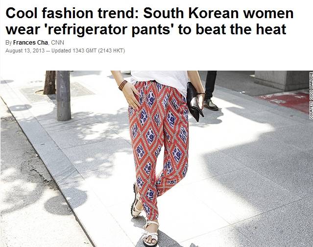 CNN은 "북아시아 폭염이 기승을 부리면서 한국의 냉장고 바지가 붐을 일으키고 있다"며 "최근 한국은 '쿨링'에 맞춘 패션 아이템이 큰 인기를 얻고 있는 추세"라고 전했다.