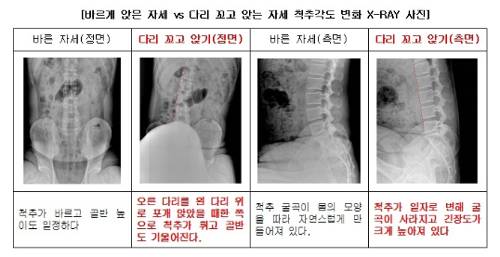 문제는 장시간, 습관적으로 다리를 꼬는 경우다. 송준혁 바른세상병원 척추센터 원장은 "조사 결과처럼 공부나 일에 집중하다보면 자기도 모르게 다리를 꼬고, 꼰 자세를 그대로 유지하며 다리를 꼬았다는 사실 조차 잊을 때가 많다. 이런 일이 장기간 반복되면 근골격 통증과 변형을 초래할 수 있어 주의해야 한다"고 설명했다.