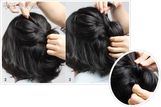 머리카락을 살살 빼서, 정수리 볼륨감을 조절한다. STEP 3.고무줄이 노출되는 것이 싫다면, 머리카락으로 한 바퀴 감싼 뒤 실핀으로 고정시킨다.