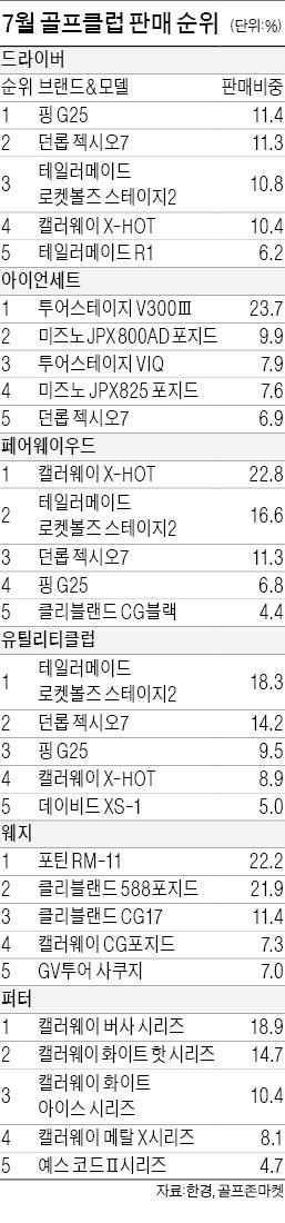 한국경제신문과 골프존마켓이 공동 조사한 7월 골프클럽 판매 순위에서 처음으로 핑 G25 드라이버가 1위에 올랐다.