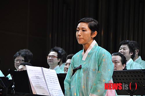 【알마티(카자흐스탄)=뉴시스】김상욱 기자 = 27일(현지시각) 카자흐스탄 알마티 필하모니 극장에서 열린 남성합창단 '이마에스트리(IMaestri)'가 멋진 공연을 선보이고 있다. 공연의 피아노 반주를 맡은 이명박 전 대통령의 딸 이주연씨가 관객들에게 인사를 하고 있다.