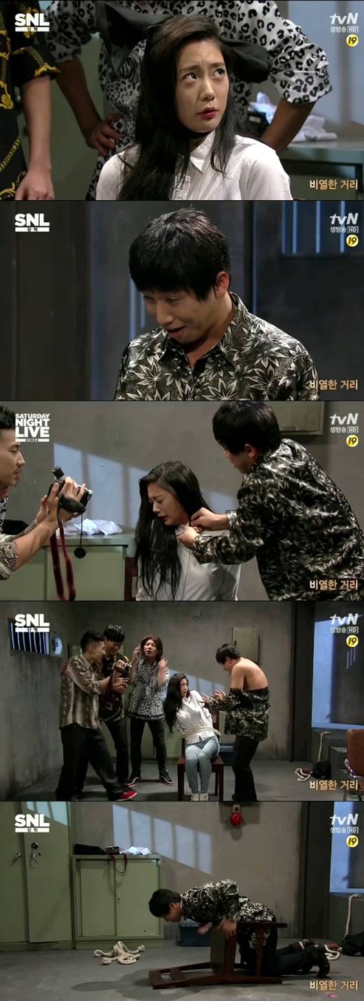이날 영화 '비열한 거리' 코너에서 건달로 변신한 SNL 크루들의 콩트 연기로 웃음을 자아냈다. 유세윤과 박재범 박상우 정성호 패거리는 클라라를 납치했다.