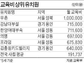 전국에서 가장 비싼 유치원인 우촌유치원은 월 교육비가 100만원이었다. 이 유치원은 학급당 원아 20명에 내국인 교사 2명과 원어민 보조 교사 1명을 배치해 영어로 수학이나 사회 등 주요 과목을 가르치는 '이머전 교육'을 한다.