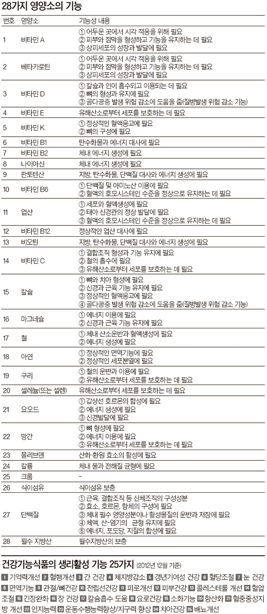 반면 건강기능식품은 건강한 사람이 복용하는 게 기본이다. 식품이기 때문이다. 가령 비타민C 제품을 놓고 비교하면 일반의약품은 '육체 피로 회복'이라는 표현을 할 수 있다. 하지만 건강기능식품은 할 수 없다. 대신 ①결합조직 형성과 기능 유지에 필요 ②철의 흡수에 필요 ③유해산소로부터 세포를 보호하는 데 필요 등 세 가지 기능성 내용만 표현 가능하다.