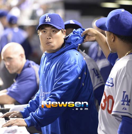 2013 미국 메이저리그 콜로라도 로키스-LA 다저스 경기가 한국시간 9월4일 오전 9시40분 콜로라도 덴버 쿠어스 필드에서 열려 다저스 볼케즈 선수가 류현진 후드티 모자에 담긴 해바라기씨를 빼내고 있다.